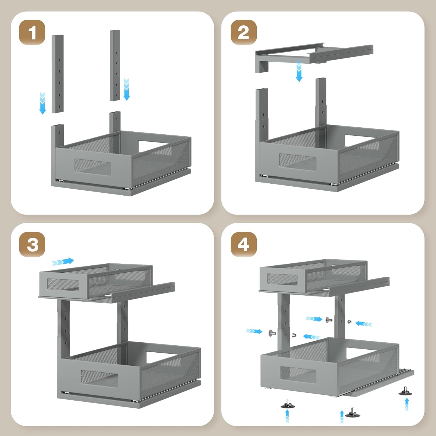 - 【Easy Installation】Say goodbye to complicated assembly! With 90% of the components pre-assembled, simply tighten 2 screws and your spacious undersink organizers is ready in just 40 seconds.