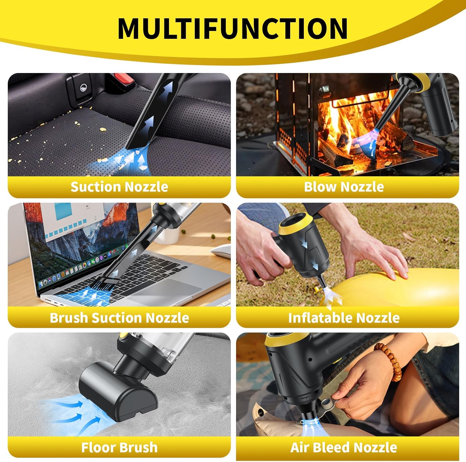 - 4-in-1 Multifunctional Design – Effortlessly switch between blowing dust, vacuuming debris, deep-cleaning with vacuum suction, and inflating items like air mattresses or sports balls. Perfect for cars, homes, garages, camping, and outdoor adventures.