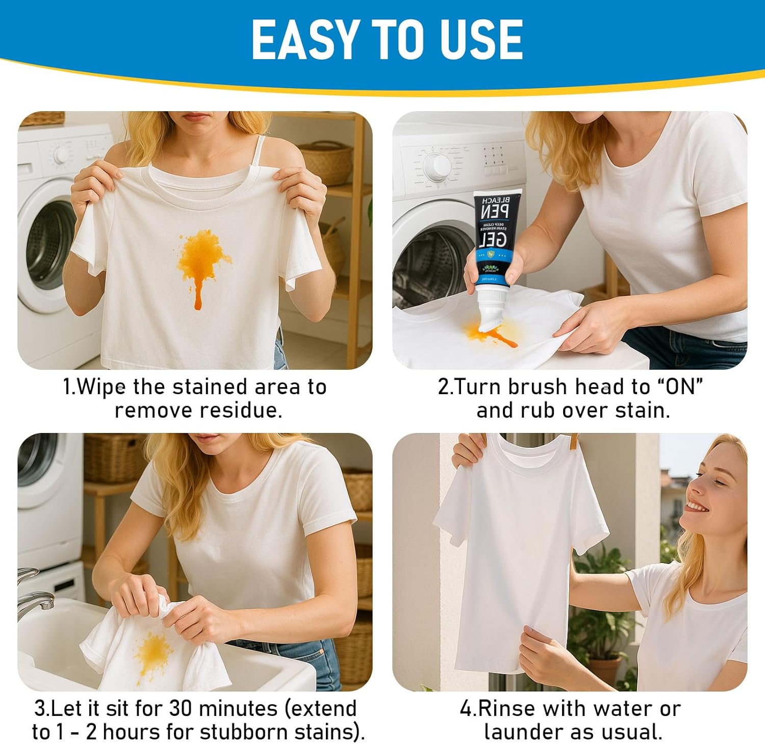 - Easy to Use – Simply wipe residue, twist brush head to ON, apply gel to the stain, let sit for 30–60 mins (up to 2 hrs for tough spots), then rinse or wash as usual.