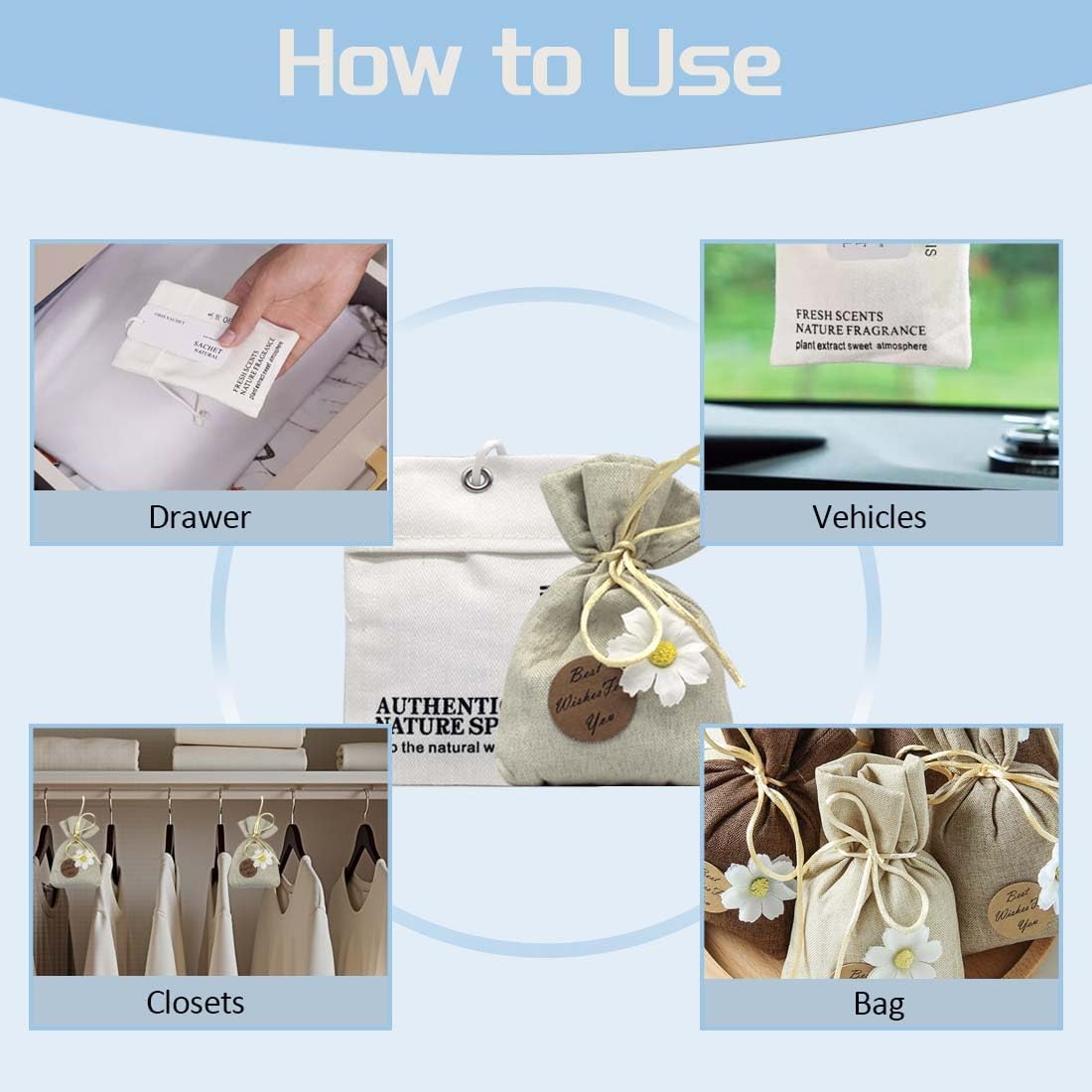 - HOW TO USE A SACHET - There are many ways to use a sachet. You can store your sachet in a drawer with linens to give them an enjoyable fragrance, you can keep a sachet in exercise bags, closets, vehicles, and many other places to freshen things up