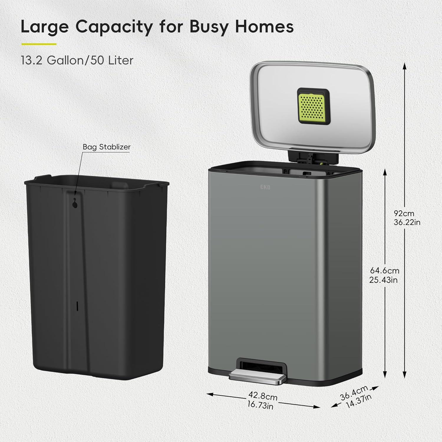 - Elevated Inner Bucket with Handles: The Madison stainless trash can features a raised inner bucket with convenient handles, ensuring swift and hassle-free bag replacement.