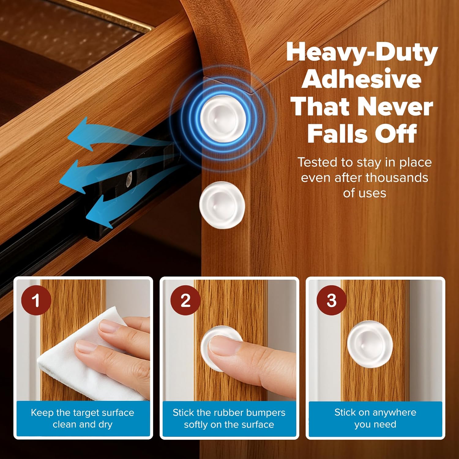 - Protects Cabinets & Drawers – Prevent slamming, scratching, and impact with cabinet door bumpers that provide a soft, cushioned barrier. These rubber bumpers have self-adhesive pads that absorb shock, extending the life of your cabinets, drawers, and furniture. Also effectively reduces noise and prevents damage to walls and door handles.
