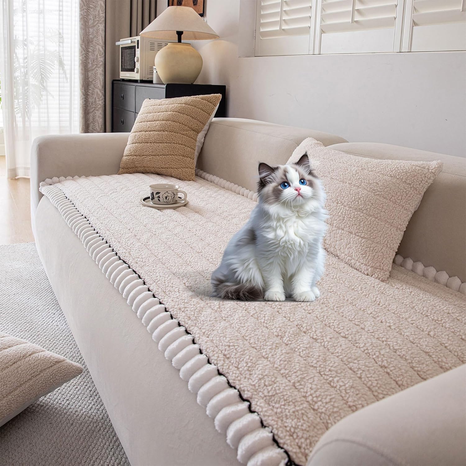 OTOB Sofa Covers for 3 Cushion Couch Washable, All Seasons Fuzzy Non Slip Kids & Pet Friendly Dog Bed Mats Couch Cover, Soft Plush Sofa Slipcovers Furniture Protector (Beige, 27.6" x 70.9'')