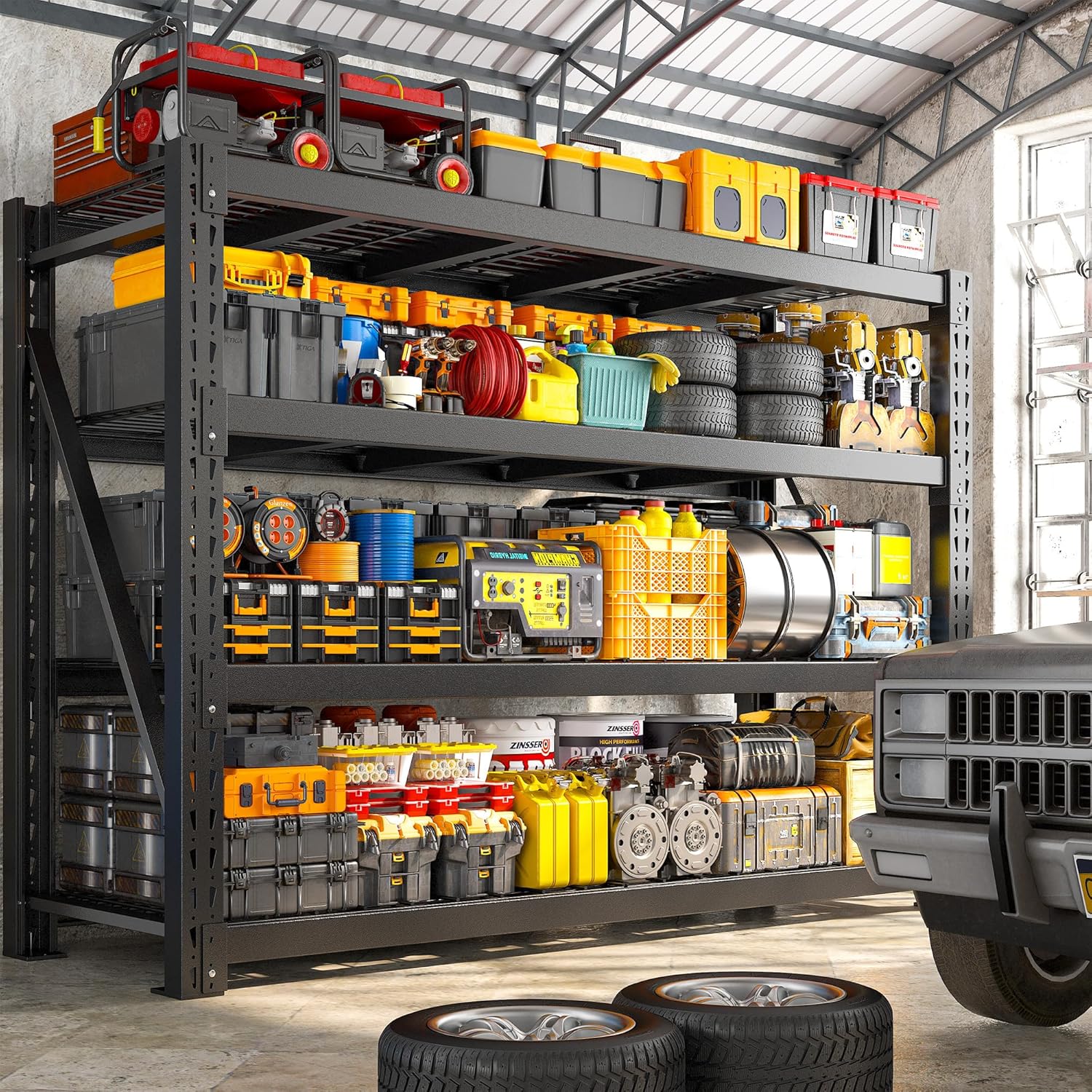 - 【Adustable Industrial Shelving】Heavy duty garage shelving with adjustable design, no need for tools to adjust the height of the tiers to DIY storage space, whether it's a large garage tools accessories or small items can be easily stored.