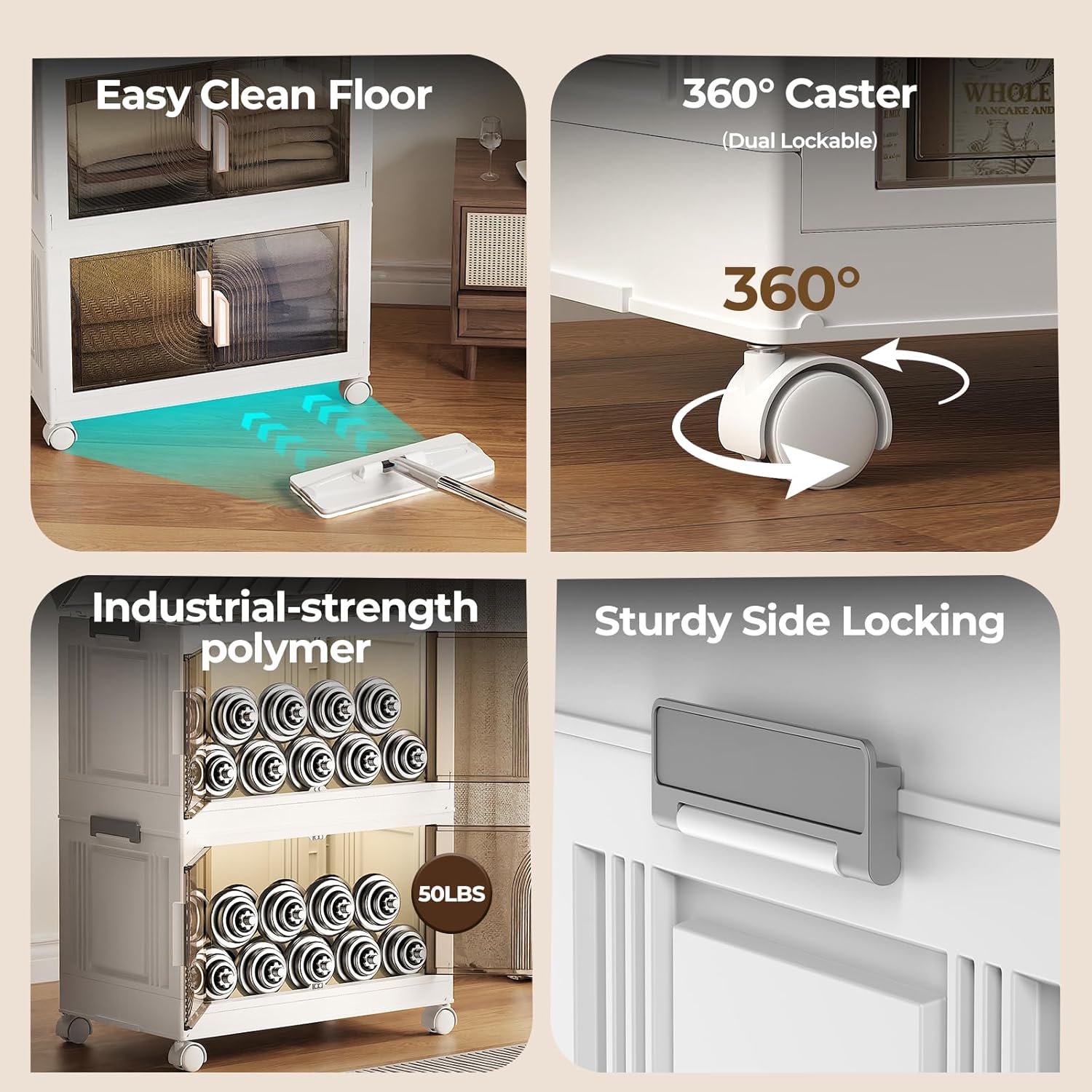 - 360° Mobility: Equipped with smooth-rolling casters for easy to move them around for versatile use or to clean the floor even when full. Two lockable wheels provide stability. Casters can be removed for permanent placement.