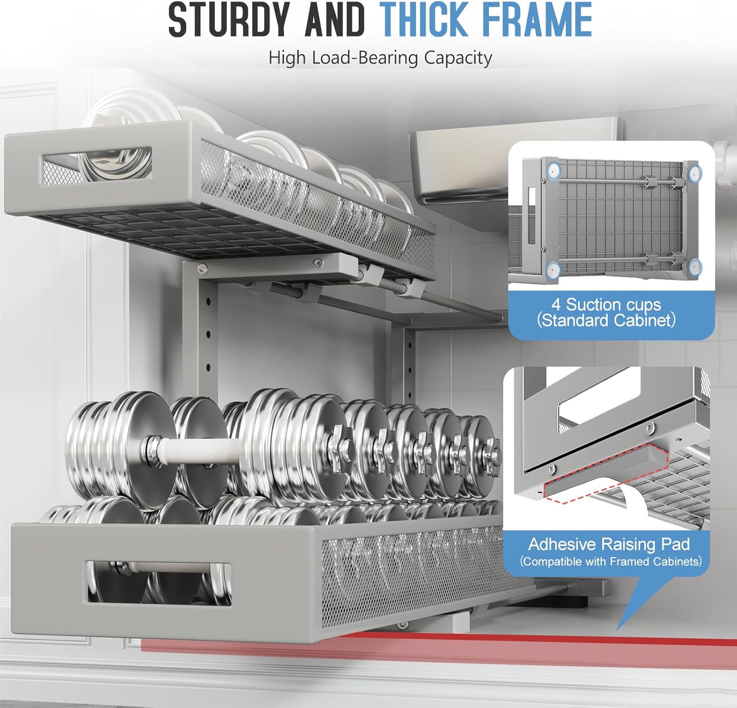 - 【2-Tier Pull-Out Design for Easy Access】This under-sink organizer features a double-layer pull-out design, allowing you to easily access items at the deepest part. The upgraded, thickened iron circular sliding rails ensure a smooth and seamless pulling experience, making each use effortless. The unique pull-out locking mechanism effectively prevents the drawers from being completely pulled out, avoiding the risk of items falling or structural damage caused by over-pulling, ensuring safer.