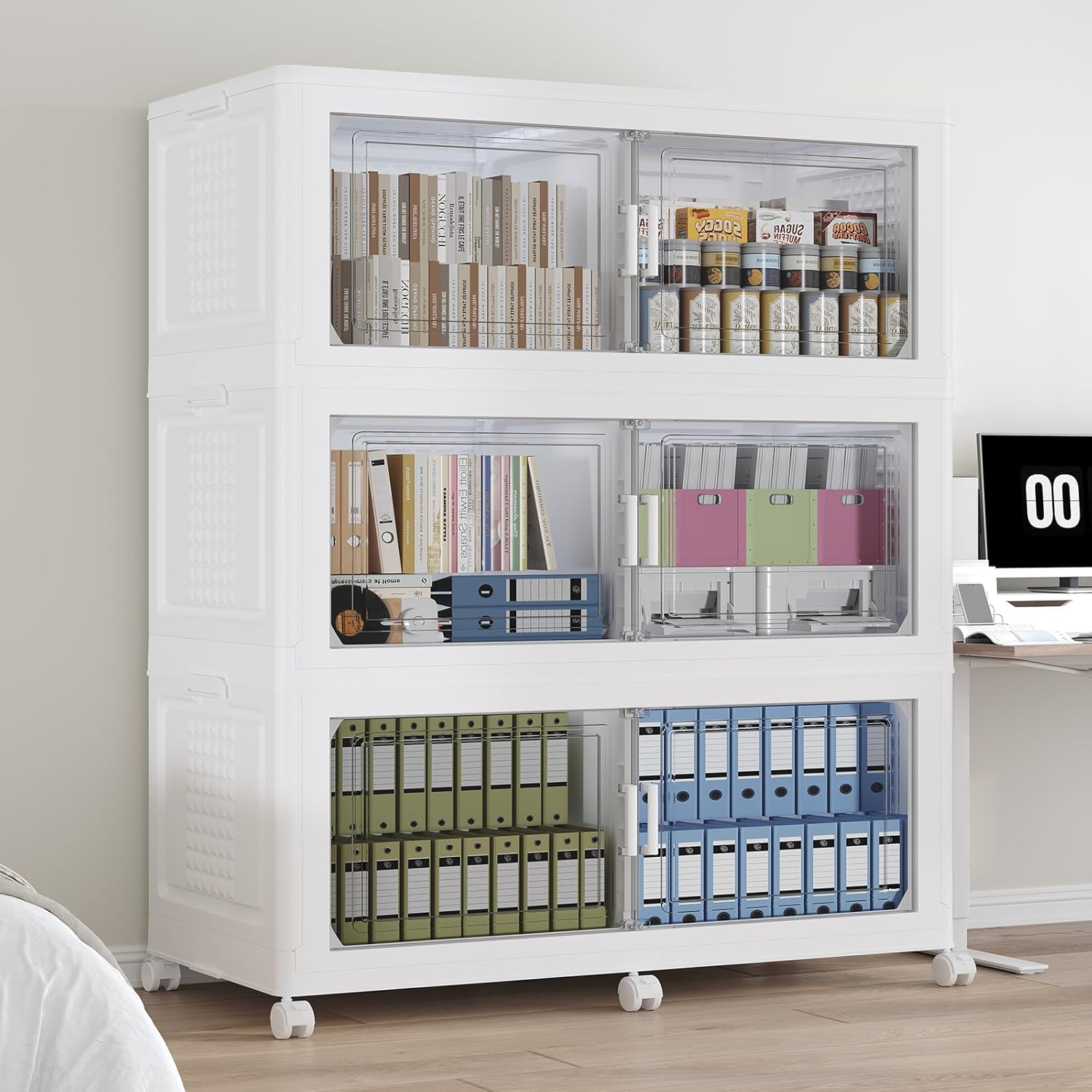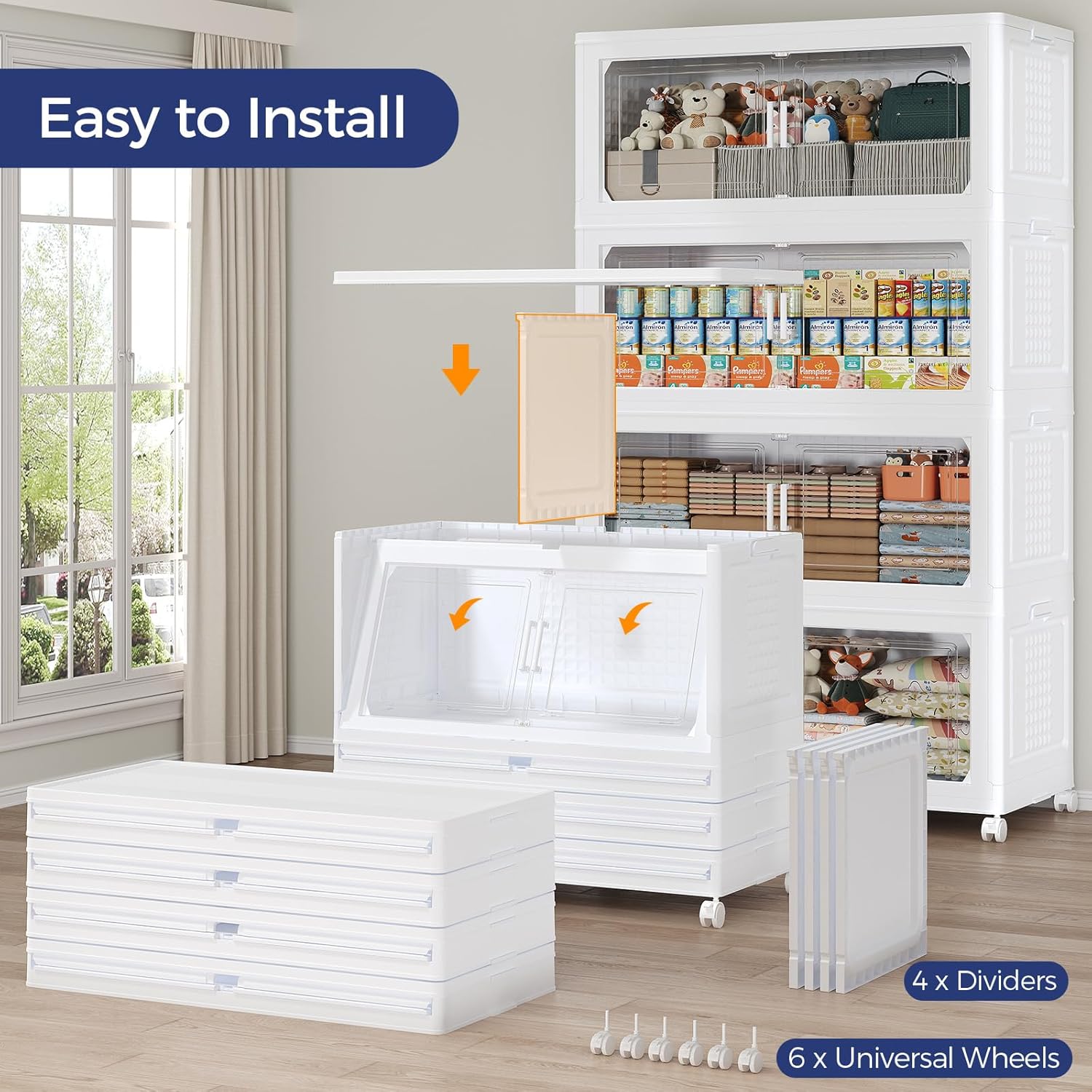 - 【6x Wheels, Foldable, Stackable, No Assembly】Fangtueh stackable storage bins open front can be quickly unfolded or collapsed in just 3 minutes to maximize space utilization. It can be stacked layer by layer into a cabinet, with side buckles to secure each level in place, preventing tipping or scattering. The bottom is equipped with 6 universal wheels for easy mobility. An essential large storage bin for homes and dorms.