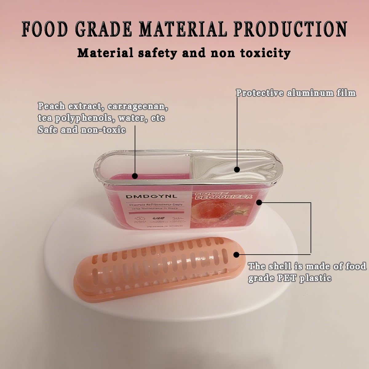 - KEEP FOOD FRESH: The refrigerator deodorizer contains peach extract, which can effectively decompose odor molecules such as ammonia, NH3, and H2S. Meanwhile, our refrigerator deodorizer is made of safe materials, and the active ingredient of the deodorizer is food-grade carrageenan. So please feel free to use it, the food in the refrigerator is healthy and safe.