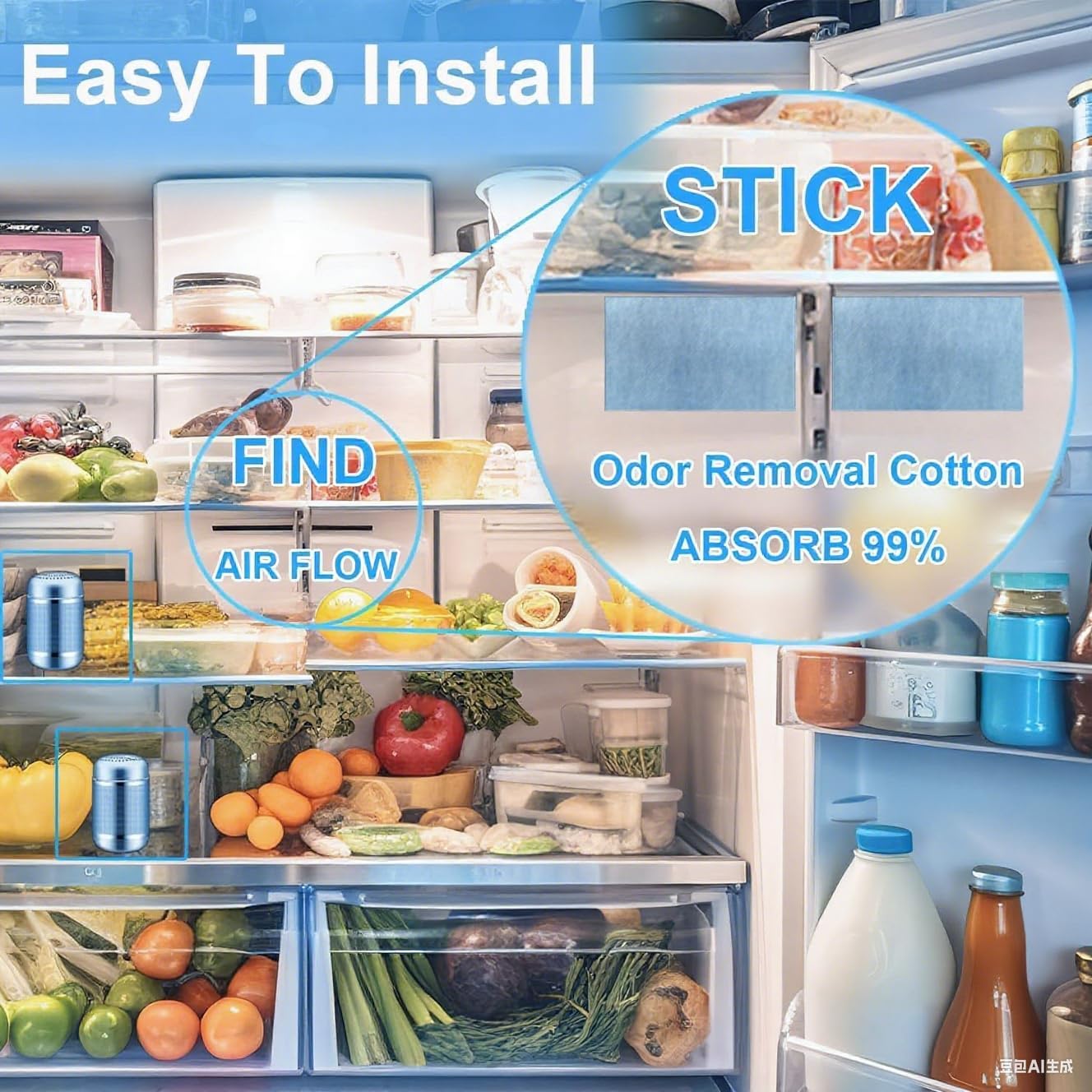 - More effective than baking soda: Simply place this fridge odor eliminator inside, attach the deodorizing cotton to the circulation vent, and it does the job—no power supply needed, never saturates, causes no secondary contamination, and is entirely free of fragrances and chemicals.