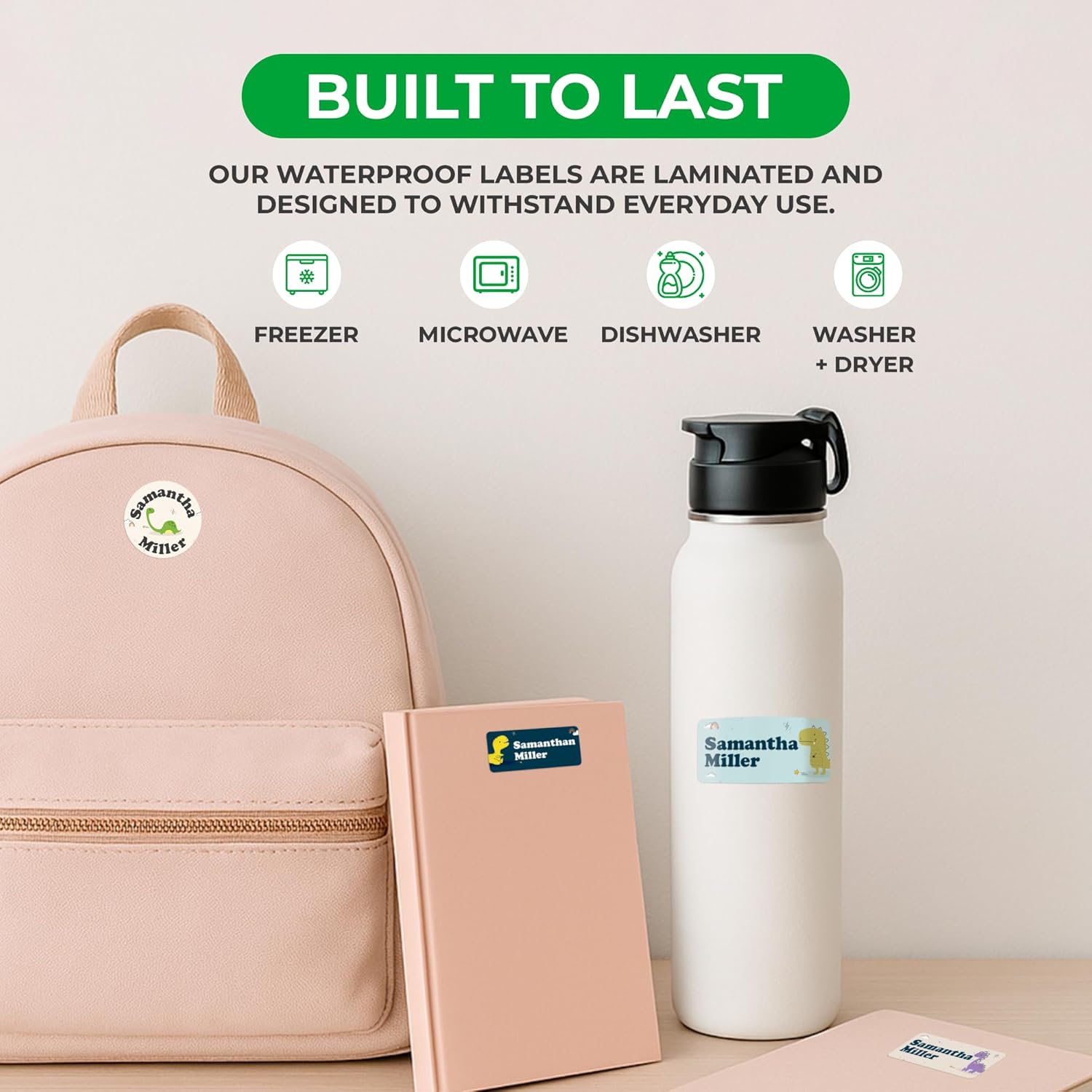 - 💧 Waterproof Stickers & Fade-Resistant — Laminated for long-lasting use, our custom stickers personalized won’t peel, fade, or rub off. Keep your kid’s name visible no matter where the day takes them. These waterproof vinyl labels stick to bottles, lunch boxes, clothing, notebooks, and more. Designed to survive dishwashers, microwaves, freezers, and even washer/dryers!