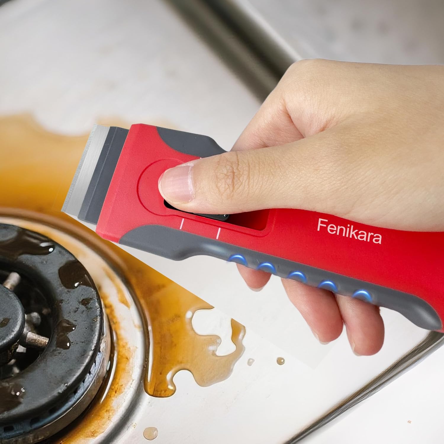 - 【Easy to Use, Comfortable to Grip Cleaning Scraper】 Ergonomic Push-Pull Design for Safety and Convenience Our razor blade scraper is designed with a user-friendly push-pull mechanism that combines convenience and safety. Its compact, ergonomic shape makes it easy to use while minimizing effort. The rubberized edges provide a comfortable, non-slip grip, allowing you to clean from any angle and tackle a variety of surfaces effortlessly. Enjoy a seamless cleaning experience with every use!