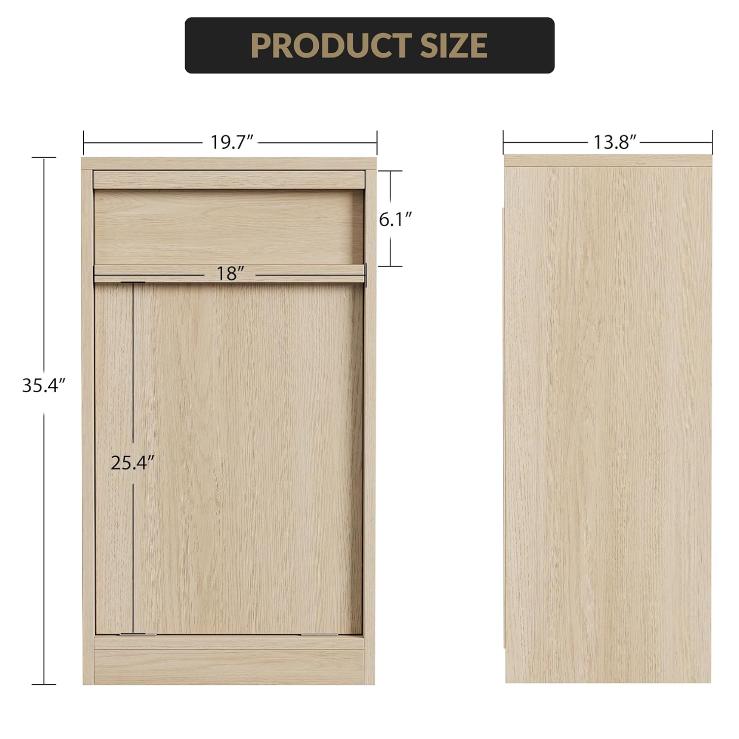 - Ample Storage Space: Measuring 19.7"L x 13.8"W x 35.4"H, this cabinet fits a 10-gallon trash can and features two compartments—an upper drawer for easy access and a lower tilt-out section for hidden waste. The tilt-out door opens up to 30°, making trash disposal effortless.