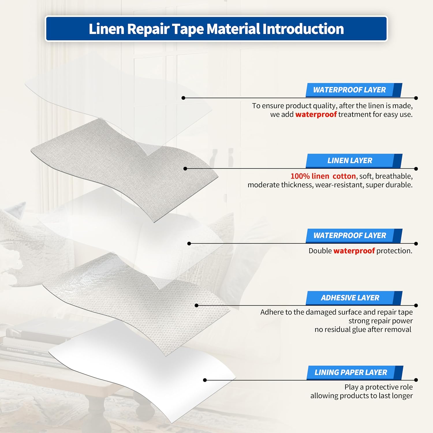- Easy Application: Clean the damaged area, cut to the appropriate size, peel off the backing paper, and stick it to the damaged area. It only takes a few seconds to complete, and the repair effect is natural and tidy. Suitable for repairing linen products such as sofas, curtains, cushions, furniture, interior decorative fabrics, etc.