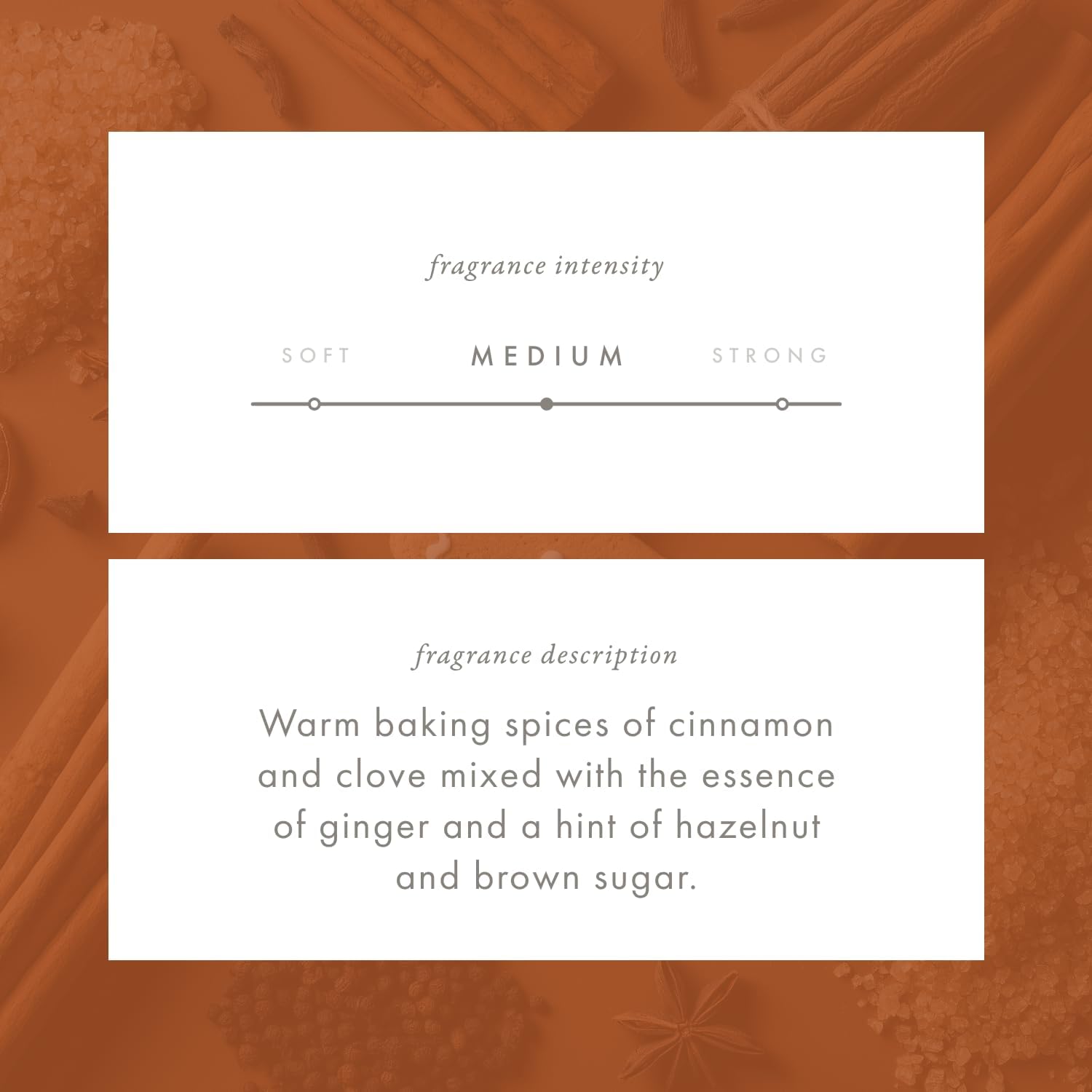 - Seasonal Spice Scent – A medium-strength, odor-neutralizing fragrance where warm cinnamon and clove blend with ginger, hazelnut, and brown sugar, layered over buttercream and peach top notes, a heart of coconut, hazelnut, and cinnamon, and a sweet base of vanilla and benzoin. From the Edible–Spice family, it smells like baking fresh gingerbread cookies over the holiday season.