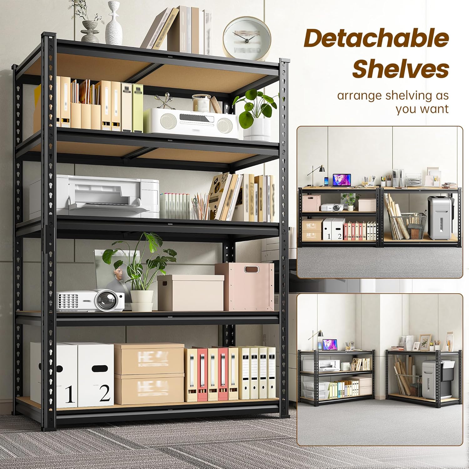 - 【Adjustable and Detachable Metal Shelves】 You can customize the height of the shelves according to your home needs. The metal shelving is designed with adjustable connectors, and each layer can be adjusted according to the height of the items. In addition, you can freely disassemble and combine your storage racks according to your needs. The shelving unit can be transformed into workbenches or corner shelves to effectively utilize storage space